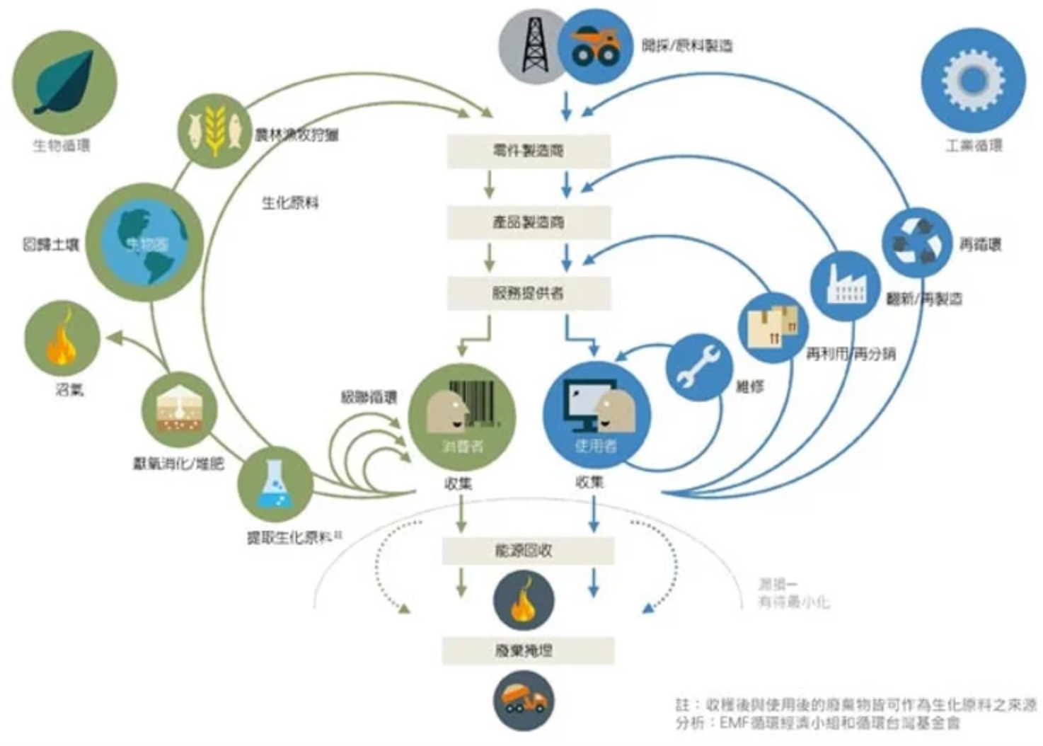 註:由世界著名航海家Ellen MacArthur所創辦。EMF 基金會,鼓勵產業、學校、各國政府一同來推動循環經濟,促成其主流化。並透過基金會的平台提供知識、資源和合作機會,來加速各產業從線性經濟邁向循環經濟。目前和麥肯錫、世界經濟論壇合作,許多正在發展循環經濟模式的企業,如 Apple、雷諾汽車、飛利浦、可口可樂、H&M、IKEA 等皆為 EMF 基金會會員。資源循環台灣基金會 (Taiwan Circular Economy Network),為亞洲區唯一區域會員。