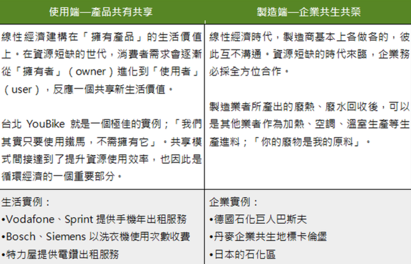 除此之外,合作和連結也是循環經濟的要素,有兩種方式:一種是在使用端推動「共有共享」的行為(Sharing),另一種則是在製造端撮合「共生共榮」的合作模式(Symbiosis)。(見下表)