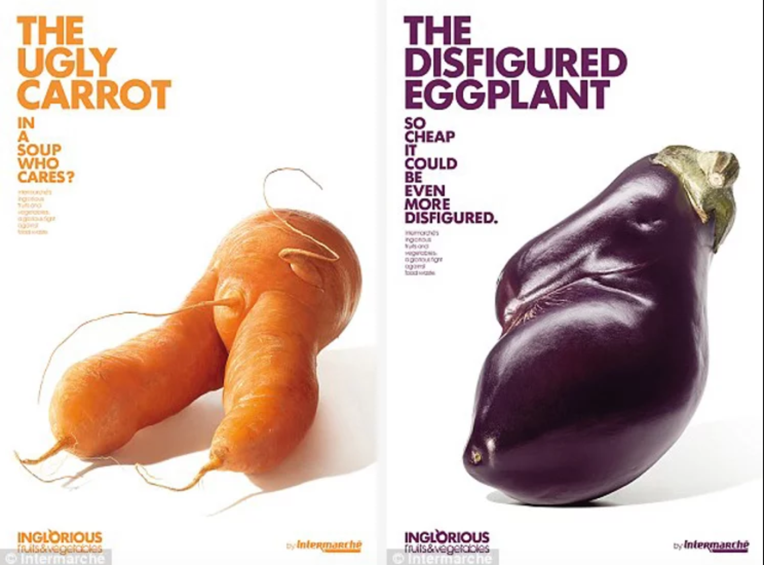 法國第三大連鎖超市Intermarché推出一系列極富創意的「醜蔬果行銷」,引用知名美國電影《惡棍特工》(Inglorious Basterds)片名,打造「不光榮蔬果」(Inglorious fruits & vegetables)的品牌,幽默地吸引民眾目光。還為蔬果拍攝沙龍照,顯示它們醜又可愛的一面,再搭配30%折扣,設立專區販售。親民、流行性的行銷模式,配合果汁、湯等多元產品的選擇,讓醜蔬果一炮而紅,銷售一空!此舉不但為超市帶來更多利潤,也成功教育消費者,形貌不佳的食物,既富營養又可口。