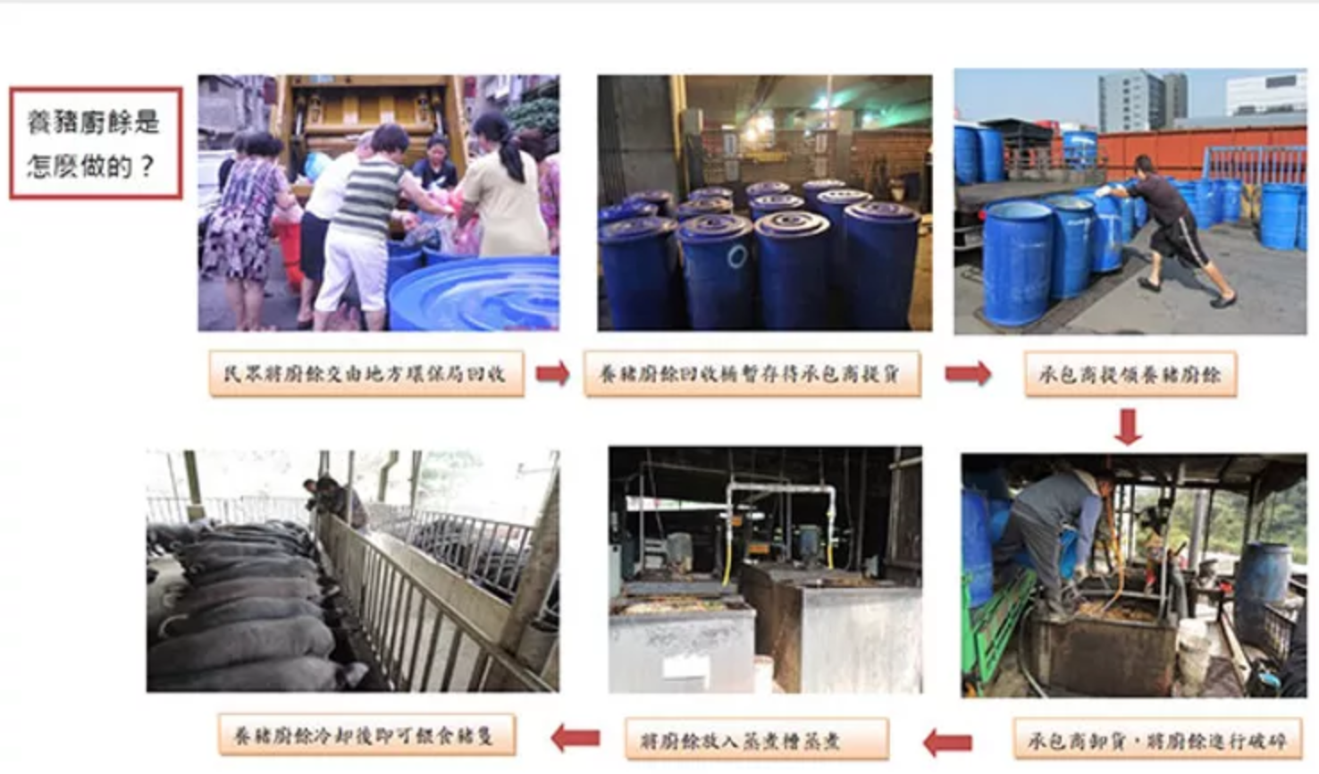 根據環保署統計,台灣「家戶廚餘」回收量,從10年前的46萬公噸增加到目前80萬公噸,其中高達71%作為養豬使用。要作為養豬的廚餘,必須依照環保署公告的「廚餘回收再利用操作管理參考手冊」中的規範,將回收廚餘加熱到90℃以上(中心溫度),且需維持至少1小時,並持續攪拌,經過蒸煮殺菌後,才能作為飼料養豬。但這過程目前仍沒有統一的品質管控,無法確保每批蒸煮後的廚餘品質,都達到政府規定的要求。