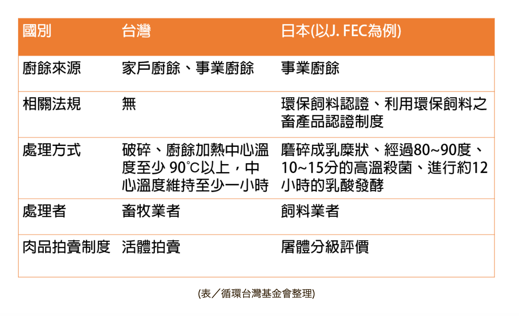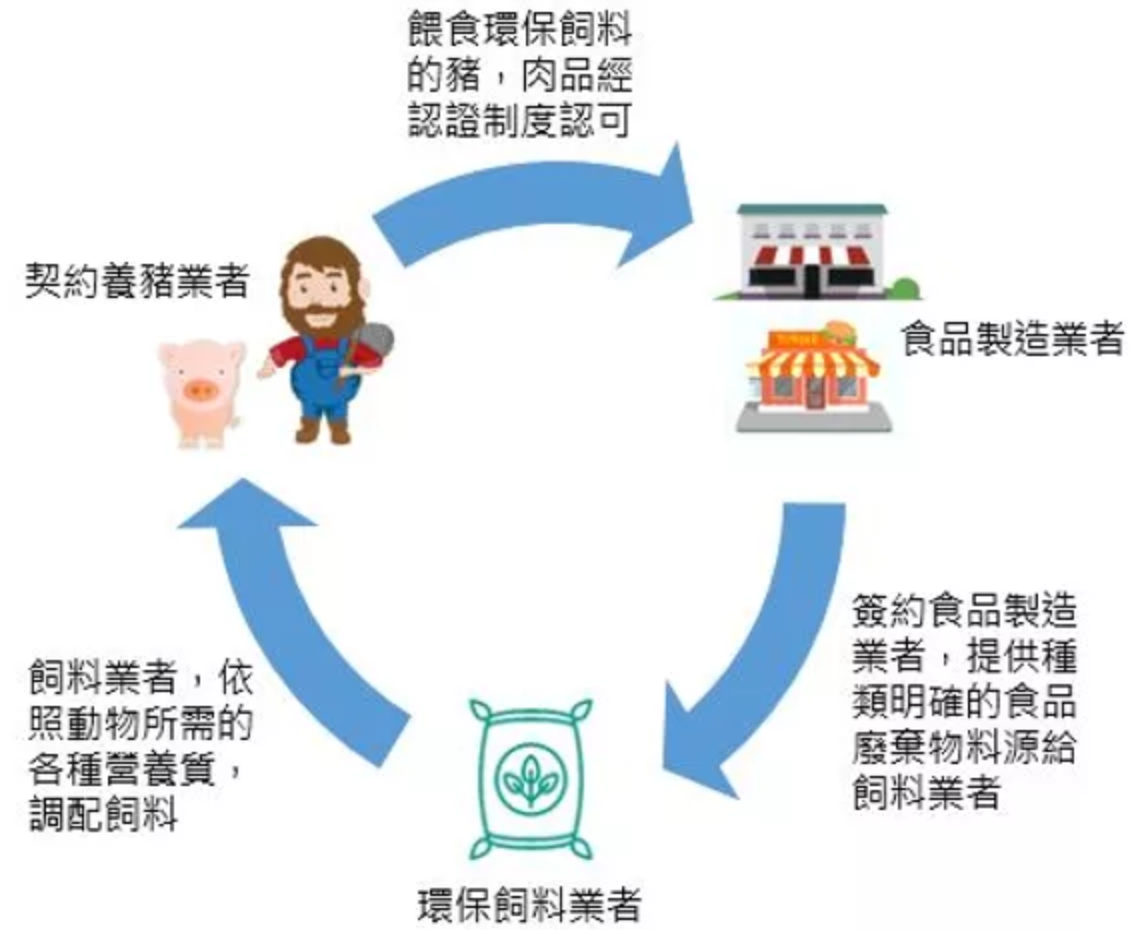 在日本,使用食品廢棄物製成的飼料稱為「環保飼料」,全日本有將近300家環保飼料業者。日本政府在2009年推出「環保飼料認證制度」,爾後再推出「利用環保飼料之畜產品認證制度」,讓食品廢棄物回收再製,受到國家政策的支持與法令的控管。