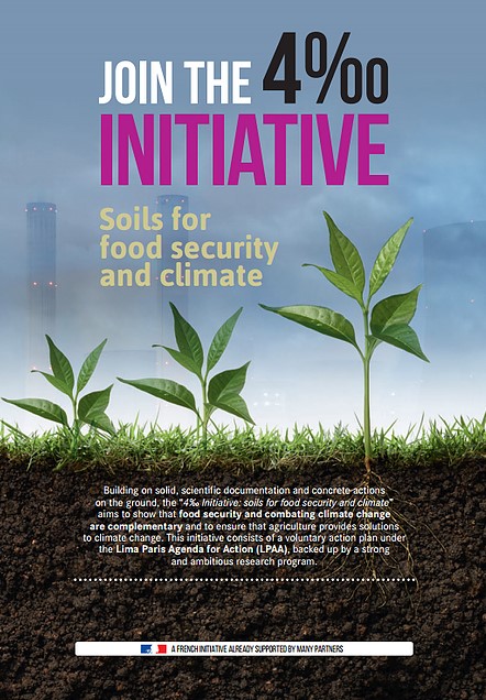 4‰倡議(The 4/1000 Initiative)為利馬-巴黎行動議程(LPAA)(註1)的自發性行動計畫,並由強而有力且具企圖心的研究計畫所支持。4‰倡議依據可靠、科學的文獻資料與具體行動,證明糧食安全(food security)和對抗氣候變遷是相輔相成,並確保農業可提供氣候變遷的解決之道。