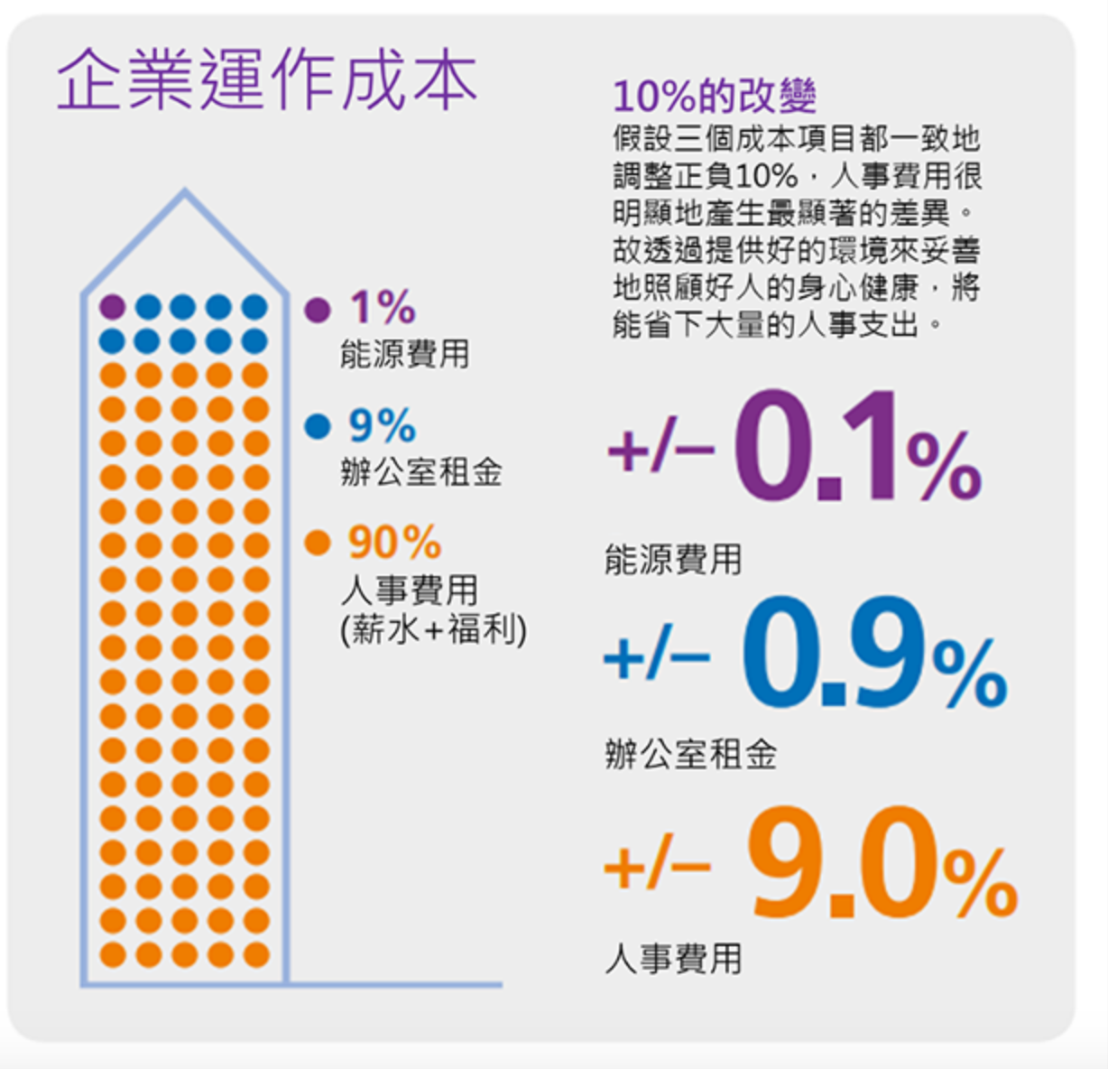 許多研究證實,建築物對我們人體的健康、心靈的幸福感,以及工作上或學習上的生產力造成的影響,遠比我們想像中的還要巨大。世界綠建築委員會(World Green Building Council/WGBC)的研究就指出,我們時常忽略一個事實,企業營運成本中,人事成本通常佔了九成,若我們願意投資在工作環境上,創造更健康、開放、互動的空間,便可以減少員工生病、請病假的天數,提升個人工作生產力,進而改善企業整體的競爭力。
