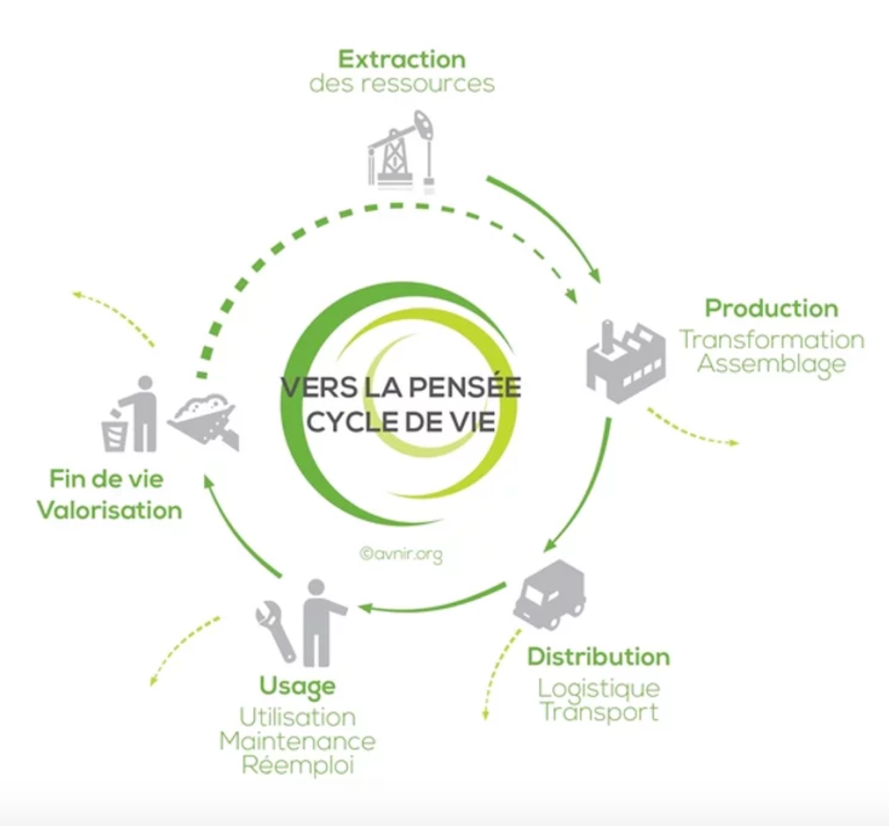 為了讓原本依線性思維形成的產品生命鏈,轉變為沒有廢棄物的迴圈,我們需要建立「生命週期的思維」(Pensée Cycle de Vie),從產出的源頭就導入「生態設計」(écoconception),並檢討產品在生命週期中所留下的生態足跡,以及最終如何不留痕跡的回收再利用。