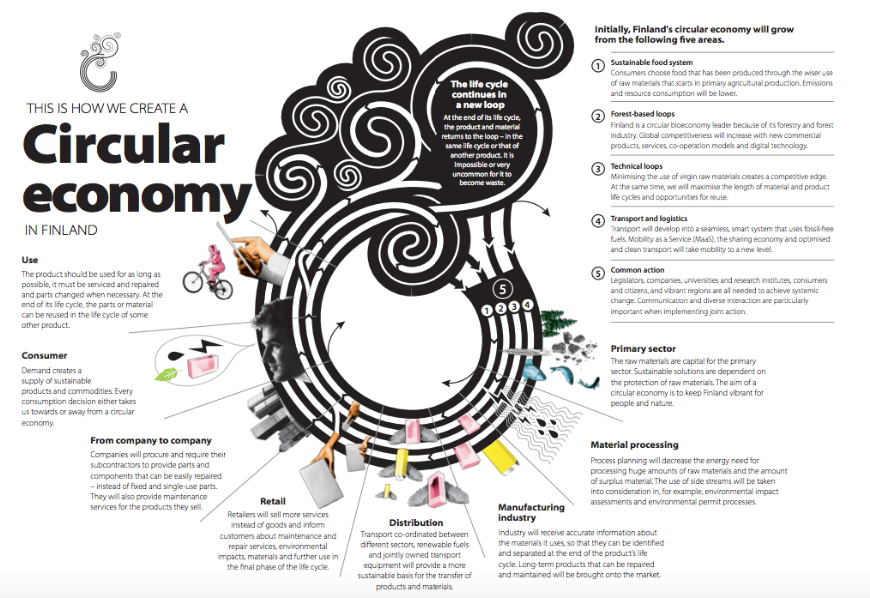芬蘭政府依據現況,選出了五個著力點,期望以這五個領域將芬蘭推向循環經濟,分別為:永續糧食系統、森林循環系統、工業循環系統、交通物流系統、共同行動。值得一提的是,為了做出一套完善的系統性計畫,芬蘭政府邀請將近 50 個不同的團體參與規劃,政府單位、企業和 NGO 都為循環經濟藍圖貢獻一份心力,使得這份計畫能夠顧及到更多元的面向。