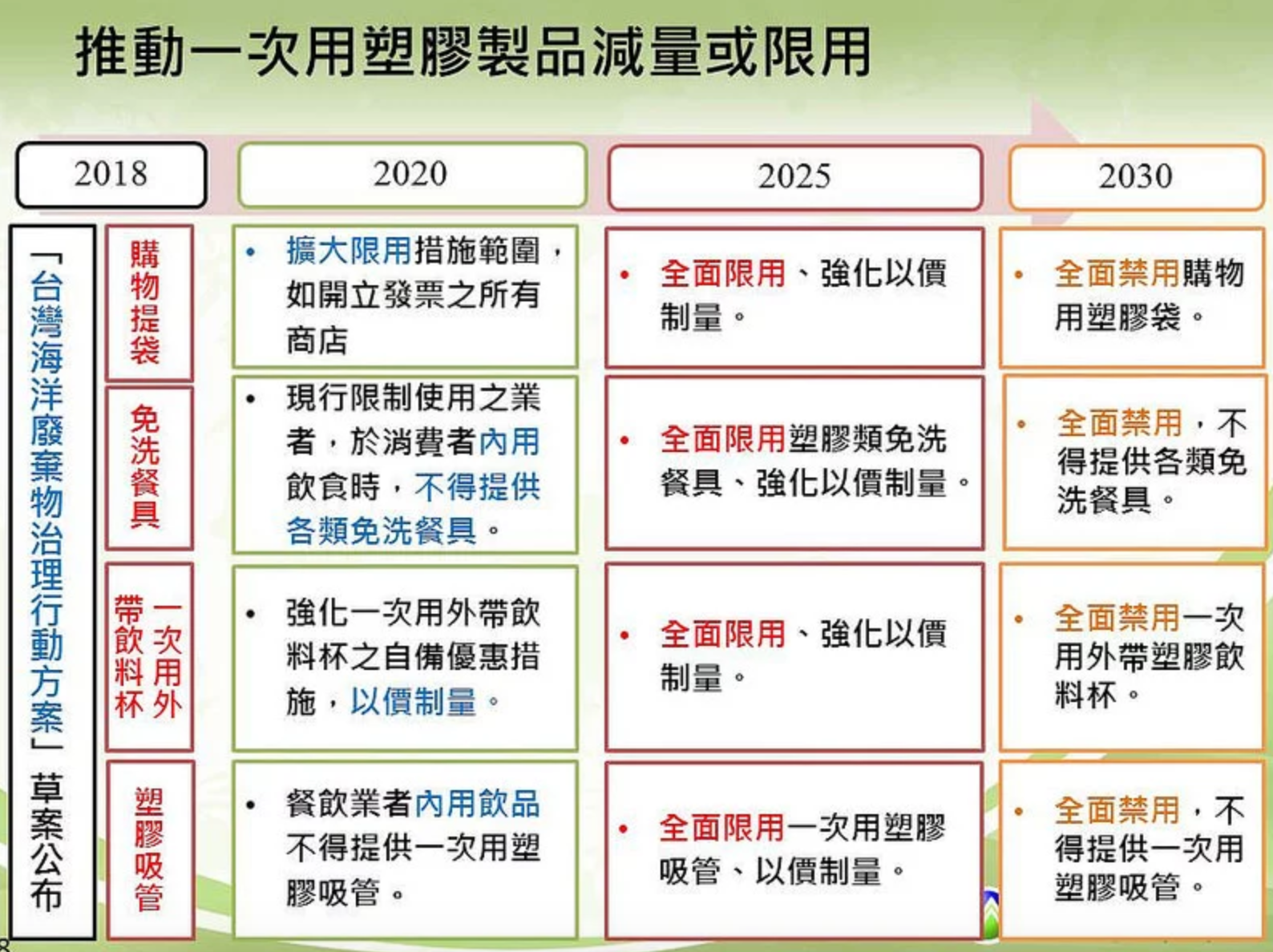 這兩年開始,台灣政府積極回應塑膠垃圾危機,從管制塑膠微粒產品開始,推出了一系列減塑政策。2018年2月宣佈的擴大限塑政策,規定部分餐廳內用不得提供免洗餐具、外帶商品不得免費提供塑膠購物袋,到了2030年將全面限用。