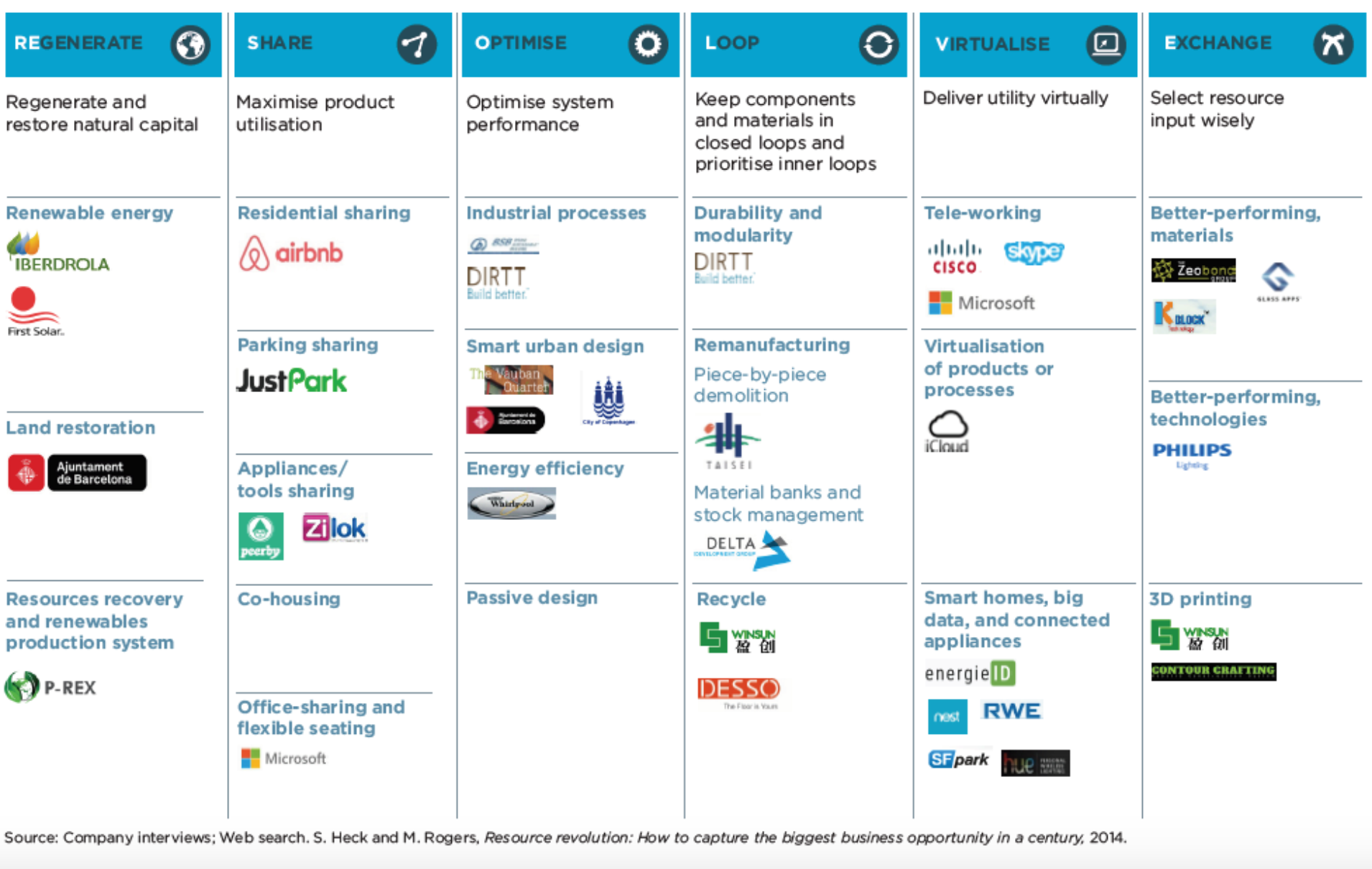 致力於推動全球循環經濟轉型的艾倫麥克阿瑟基金會(Ellen MacArthur Foundation) 與麥肯錫企業與環境中心(McKinsey Center for Business and Environment)共同出版的報告書 Growth Within: A Circular Economy Vision for a Competitive Europe中提出了 ReSOLVE 架構,將循環經濟的核心原則轉換為六種槓桿,讓企業能夠依據所屬產業的背景和既有優勢,分析可以從哪一個面向切入循環經濟的領域,新創事業也可以藉由這個架構來找尋尚未被開發的市場機會。