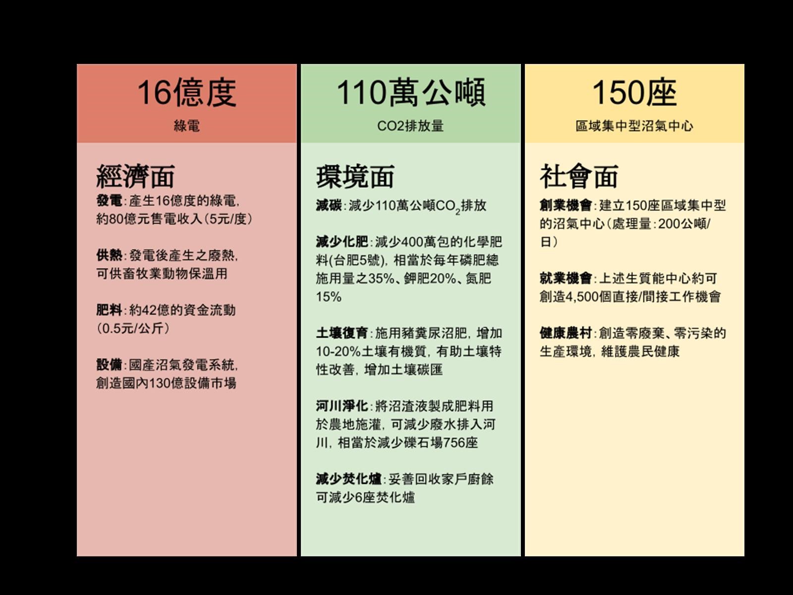 台灣估計有建置150座集中型沼氣電廠的潛力,產生的甲烷相當於年產16億度電,以替代燃煤的方式計算,相當於每年減少超過100萬噸碳排,再加上減少甲烷逸散的排放量。沼氣產業扮演著台灣邁向淨零碳排的重要角色,也是一個產值百億以上、提供 4500個就業機會的新興產業。