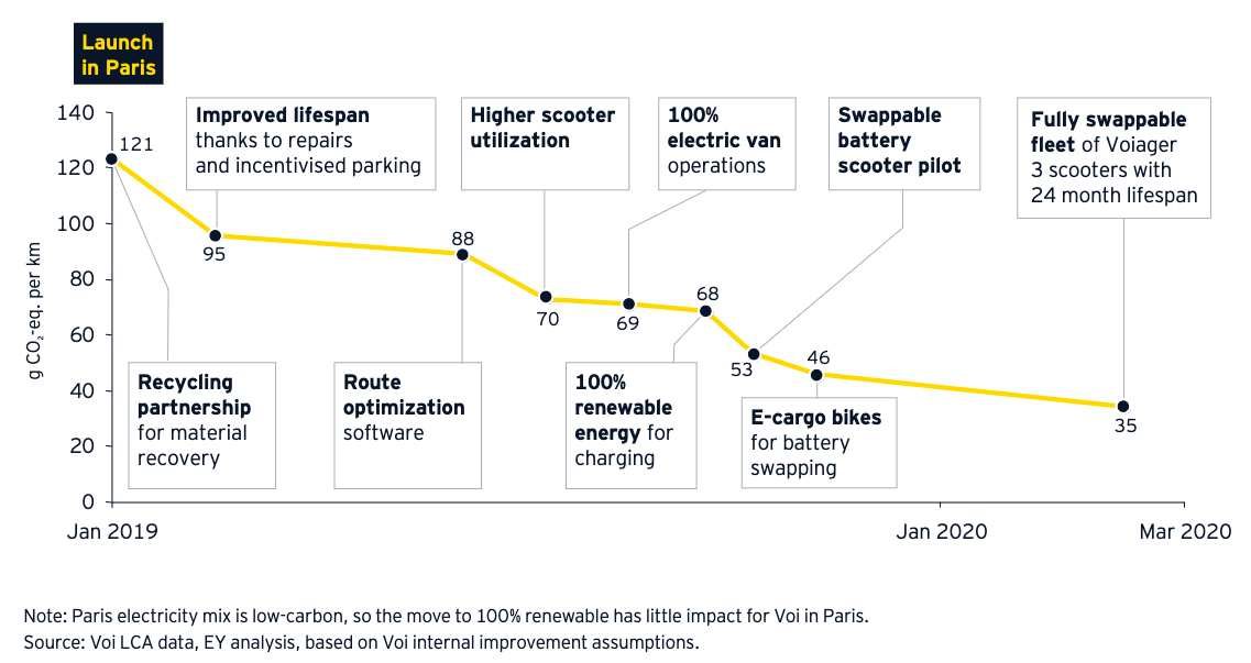 研究顯示一台電動滑板車的碳排放有50%在原料取得、製造階段產生,其中包括高碳排的鋁框架、鋼部件、鋰離子電池和馬達,因此延長產品生命週期便能大幅度減少電動滑板車平均碳排。在近期電動車的減碳效益被質疑下,Voi 宣示將所有電動滑板車「零廢棄」的願景,透過多種循環策略延長產品生命週期,致使大幅降低平均使用電動車的碳排放量。