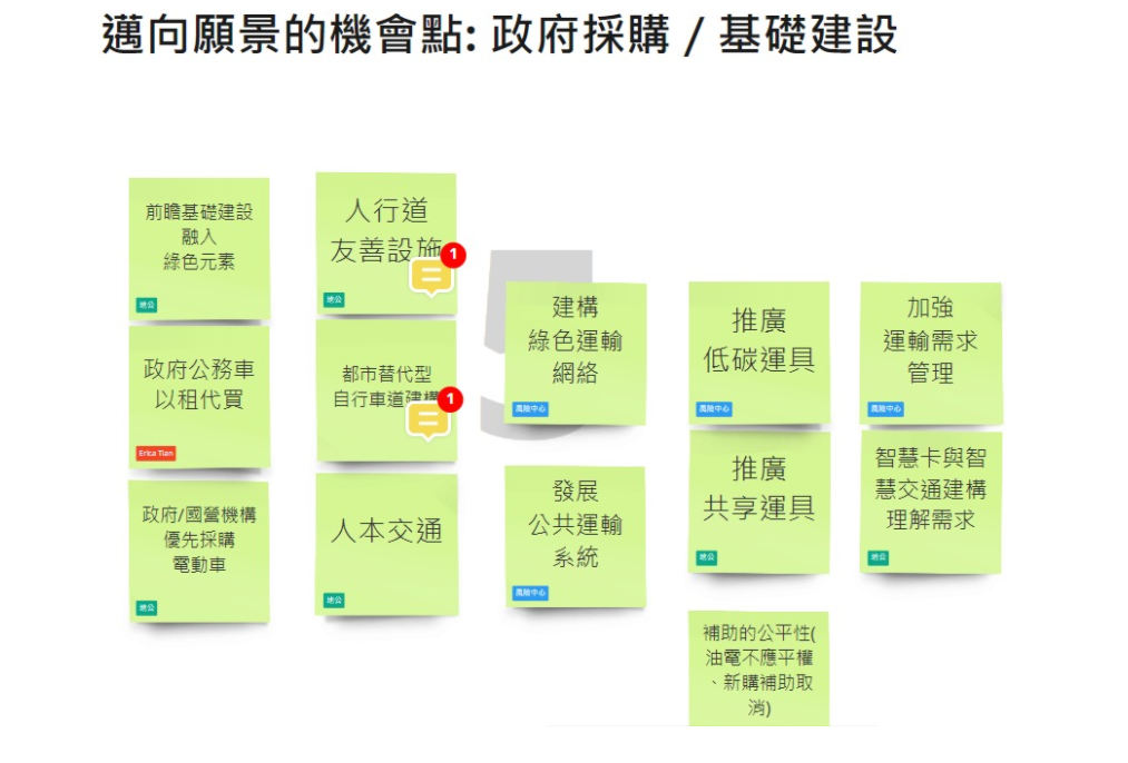 聚焦從財務、採購/投資、研發創新、法規、就業、溝通和資訊透明等項目激盪堆疊出個人、企業、政府往前邁進的可行方案。